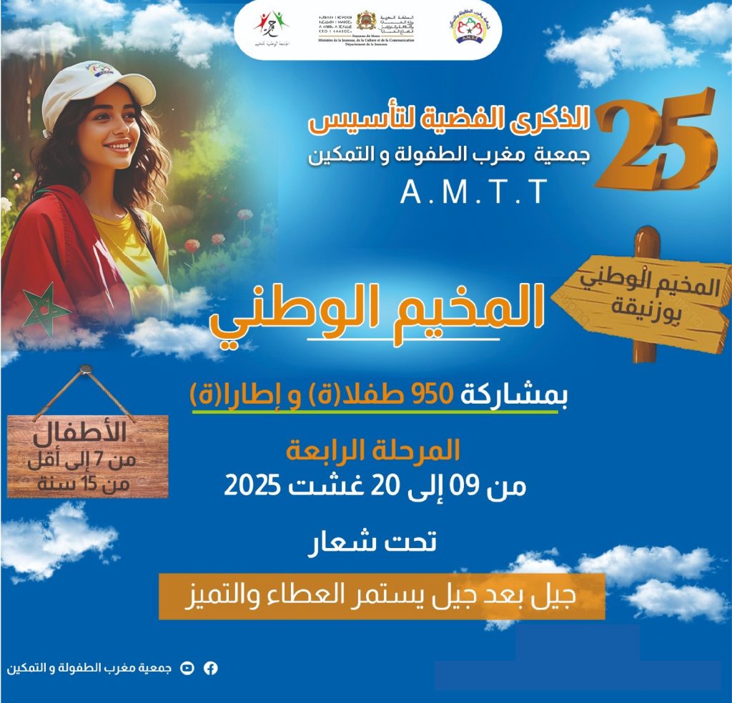 تحت الرعاية السامية لصاحب الجلالة الملك محمد السادس نصره الله وأيده، وفي إطار البرنامج الوطني للتخييم ومجالاته، وبشراكة مع وزارة الشباب والثقافة والتواصل – قطاع الشباب، والجامعة الوطنية للتخييم، تنظم جمعية مغرب الطفولة والتمكين مخيمًا صيفيًا وطنيًا لفائدة الأطفال، وذلك خلال المرحلة الرابعة الممتدة من 09 إلى 20 غشت 2025، بالمركز الوطني للتخييم بوزنيقة الشاطئ، تحت شعار: