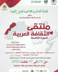 تخليدًا للذكرى السادسة والعشرين لعيد العرش المجيد، تنظم جمعية ملتقى الآفاق للثقافة والتنمية، بشراكة مع المجمع الشريف للفوسفاط (Act4Community)، ومجلس جهة بني ملال خنيفرة، والمديرية الجهوية لوزارة الثقافة، وجماعة خريبكة، وعمالة إقليم خريبكة، و الشركة الجهوية لتنمية السياحة لجهة بني ملال خنيفرة وعدد من المؤسسات العمومية والخاصة، الدورة التاسعة لملتقى الثقافة العربية، وذلك خلال الفترة الممتدة من 4 إلى 7 غشت 2025