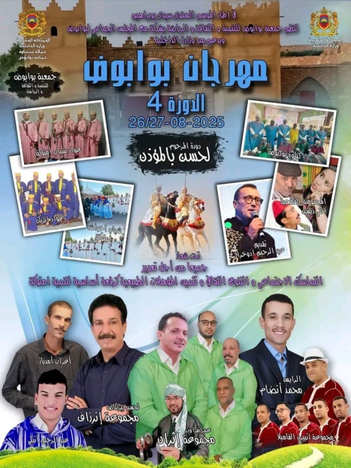 وذلك ايام26 و27 غشت 2025 . و بدعم من وزارة الداخلية مهرجان بوابوض في نسخته الرابعة وتأتي هذه الدورة تكريما لروح الفقيد الفنان لحسن بالمؤدن كماتعرف هذه النسخة مشاركة العديد من الفرق الغنائية التراتية نذكر منها على سبيل المثال …التي تتغنى بالموروث التقافي المحلي والأمازيغي