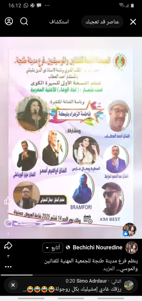 تحث إشراف المكتب المديري برئاسة الأستاذ نور الدين بشيشي والمستشار احمد الحطاب تنظم الجمعية المهنية للفنانين والموسيقيين – فرع طنجة – النسخة الأولى للسهرة الكبرى تحث شعار » ليلة الوفاء » للاغنية المغربية . بمشاركة مجموعة من الفنانين وبالمناسبة سيتم تكريم بعض الوجوه الفنية وفاعلين جمعويين وذلك يوم الأحد 14 سبتمبر 2025 بقاعة العروض حسنونة بطنجة