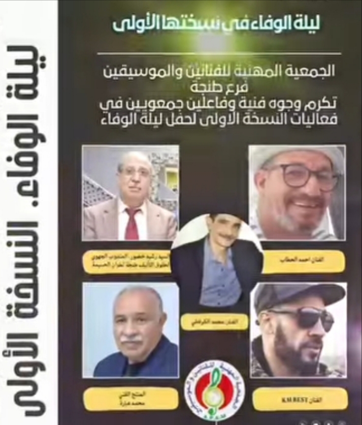 تحث إشراف المكتب المديري برئاسة الأستاذ نور الدين بشيشي والمستشار احمد الحطاب تنظم الجمعية المهنية للفنانين والموسيقيين – فرع طنجة – النسخة الأولى للسهرة الكبرى تحث شعار » ليلة الوفاء « للاغنية المغربية . بمشاركة مجموعة من الفنانين وبالمناسبة سيتم تكريم بعض الوجوه الفنية وفاعلين جمعويين وذلك يوم الأحد 14 سبتمبر 2025 بقاعة العروض حسنونة بطنجة