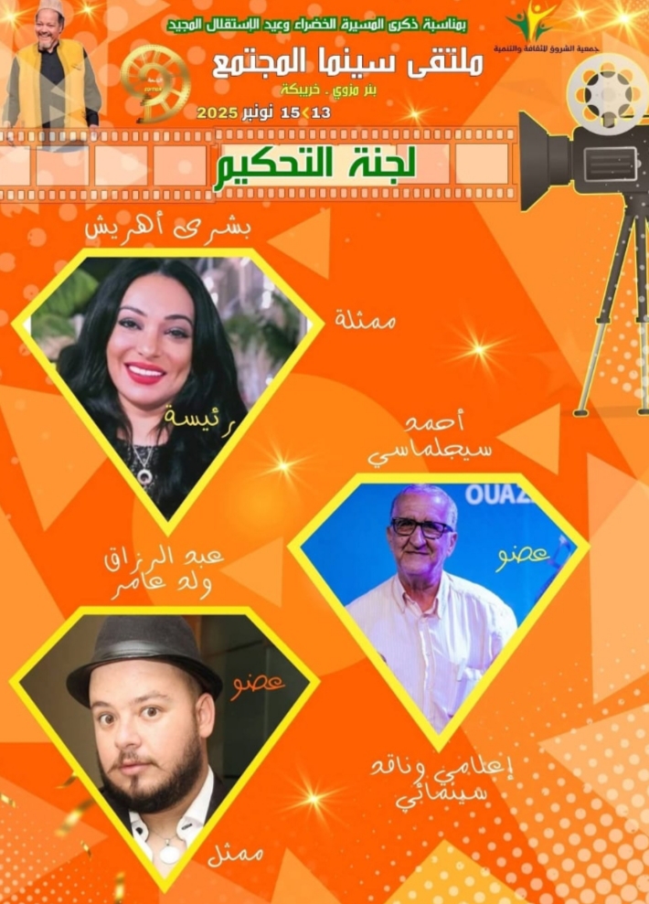 ترأس لجنة تحكيم مسابقة الأفلام القصيرة الممتلة والفنانة بشرى أهريش للدورة التاسعة لملتقى سينما المجتمع ببئر مزوي ـ إقليم خريبكة، (دورة الممثل والمخرج عبد الله فركوس)، والتي ستقام بمناسبة ذكرى المسيرة الخضراء وعيد الاستقلال المجيد، من 13 الى 15 نونبر 2025.