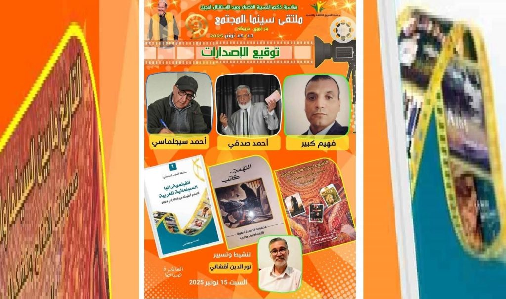 تحتفي فعاليات الدورة التاسعة لملتقى سينما المجتمع ببئر مزوي ـ إقليم خريبكة، (دورة الممثل والمخرج عبد الله فركوس)، والمنعقدة من 13 الى 15 نونبر 2025، بمناسبة ذكرى المسيرة الخضراء وعيد الاستقلال المجيد، بالكتاب ومؤلفه، من خلال توقيع عدد من المؤلفات الجديدة، التي تعزز المشهد الثقافي والسينمائي الوطني.