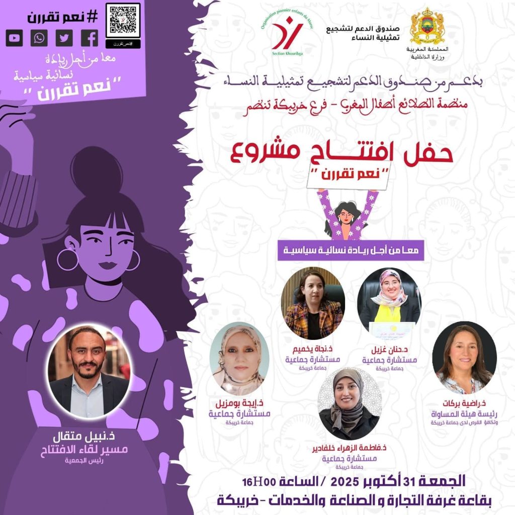 تستعد مدينة خريبكة لاحتضان انطلاقة مشروع “معًا من أجل ريادة سياسية نسائية” – “نعم تُقرّرن”، الذي يروم تعزيز حضور النساء في مراكز القرار المحلي وتشجيع مشاركتهن في تدبير الشأن العام، في انسجام تام مع التوجيهات الملكية السامية الداعية إلى تمكين المرأة المغربية وضمان تمثيلية منصفة في مختلف الهيئات المنتخبة.