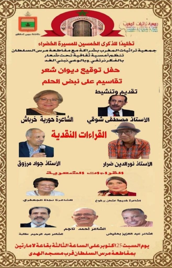 كما سيتم توقيع ديوان شعر » تقاسيم على نبض الحلم » بمشاركة اساتذة أجلاء ونخبة من الشعراء .وذلك يوم السبت 25 أكتوبر 2025 على الساعة الثالثة بعد الزوال بقاعة لامارتين بمقاطعة مرس السلطان الفداء الدارالبيضاء .