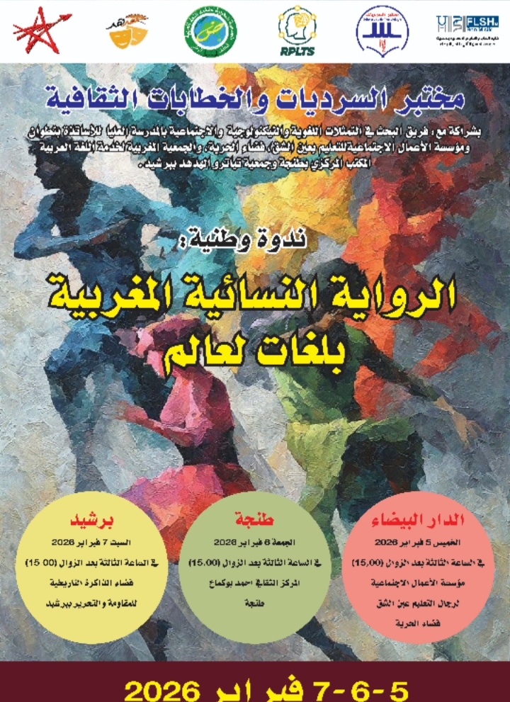 يعقد مختبر السرديات والخطابات الثقافية ندوة وطنية في موضوع: الرواية النسائية المغربية بلغات العالم، أيام 5و6و7 فبراير 2026، بشراكة مع فريق البحث في التمثلات اللغوية والتيكنولوجية والاجتماعية بالمدرسة العليا للأساتذة بتطوان، ومؤسسة الأعمال الاجتماعية للتعليم بعين الشق، فضاء الحرية، والجمعية المغربية لخدمة اللغة العربية المكتب المركزي بطنجة، وجمعية تياترو الهدهد ببرشيد، وذلك بالأماكن التالية:
