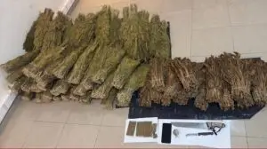 كما مكنت عملية التفتيش من ضبط 14 رزمة من التبغ الخام بوزن إجمالي قدره 11 كيلوغراماً، إضافة إلى ثلاث صفائح من مخدر الشيرا بلغ وزنها حوالي 300 غرام، فضلاً عن سكينين أحدهما كبير والآخر صغير.