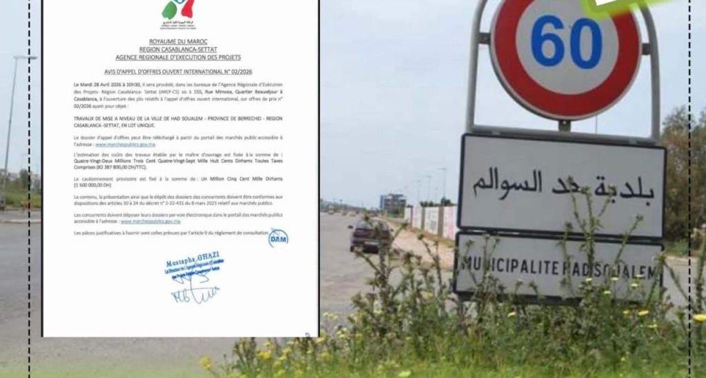 أعلنت الوكالة الجهوية لتنفيذ المشاريع لجهة الدار البيضاء – سطات عن إطلاق طلب عروض مفتوح دولي رقم 02/2026، يهم إنجاز أشغال تأهيل مدينة حد السوالم بإقليم برشيد، وذلك في إطار تعزيز البنيات التحتية وتحسين جاذبية المدينة.