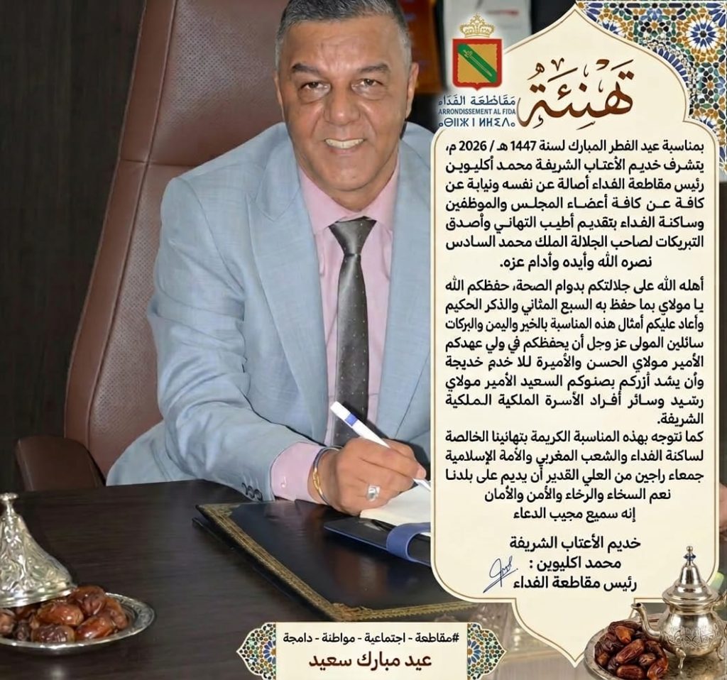 تهنئة ✍️ بقلم أحمد كوصي | 🗓️ 19 Mar 2026 | 📂 مجتمع . الدارالبيضاء …عين الحدث … ابو ايمن 📢 شارك هذا المقال: 🌐 Facebook 🐦 Twitter 📱 WhatsApp Navigation de l’article تهنئه بمناسبة عيد الفطرجمعية الأنامل الذهبية تنظم حفلا تحت شعار نساء الخير والتمكين الاقتصادي..