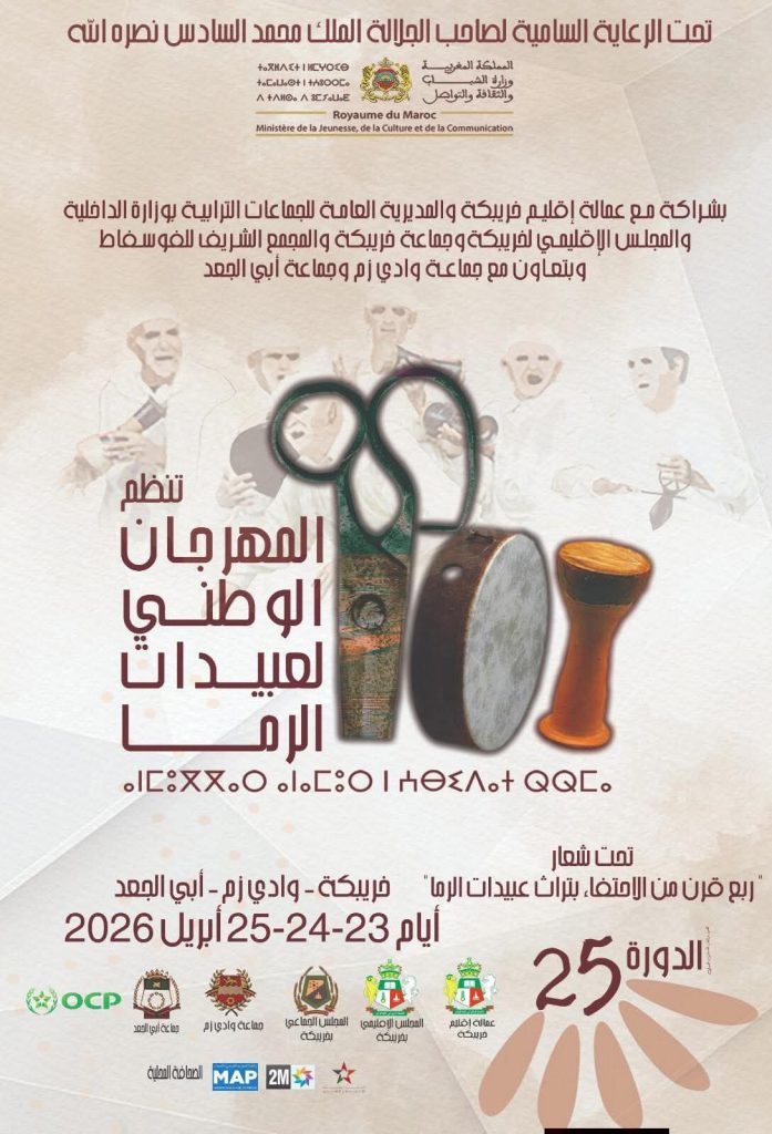 في سياق دينامية ثقافية متجددة تعرفها الساحة الوطنية، تحتضن مدينة خريبكة، ما بين 23 و25 أبريل 2026، فعاليات الدورة الخامسة والعشرين للمهرجان الوطني لفن عبيدات الرما، تحت الرعاية السامية لصاحب الجلالة الملك محمد السادس نصره الله، في محطة تؤكد التحول النوعي الذي بات يعرفه تدبير التراث الثقافي اللامادي بالمغرب.